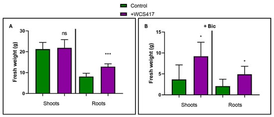 Growth promotion of shoots and roots of tomato plants inoculated with the WCS417 strain after 37 days of cultivation in a hydroponic system. Shoots were excised from roots and weighed separately. (A) Tomato plants grown in the absence of NaHCO3. (B) Tomato plants grown in the presence of 40 mM NaHCO3. * p <0.05 and *** p < 0.001 indicate significant differences between inoculated and control treatments, ns (no significant differences). Values are the means ± S.E. of 12 replicates.