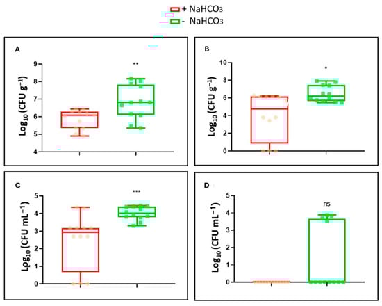 When counting bacteria during the first harvest, it was determined that both in the nutrient solution and in the roots, the bacterial count was much higher in the absence of NaHCO3 (Figure 3A,C). On the other hand, in the second harvest, the number of CFUs per gram or milliliter clearly decreased compared to the first harvest. In the presence of NaHCO3, the bacteria had completely disappeared in the nutrient solution. In the absence of NaHCO3, there were some samples where bacterial presence still persisted (Figure 3D). In the roots, although the quantity of bacteria decreased significantly compared to the first harvest, the survival was higher compared to the nutrient solution. Survival was also higher in the absence of NaHCO3 (Figure 3B).