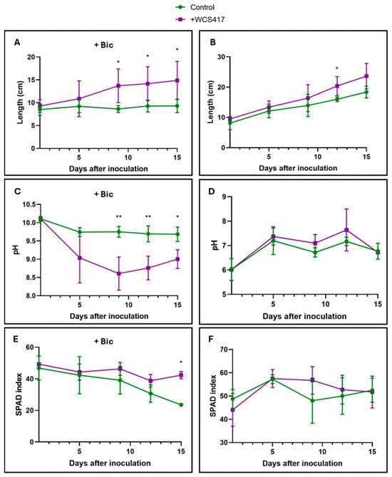 Effect of foliar inoculation with the WCS417 strain on shoot growth, acidification, and SPAD of tomato plants grown in a hydroponic system. After spraying the aerial part of tomato plants with 107 CFU mL−1 of strain WCS417, plants were transferred to individual containers. Subsequently, growth and pH evolution over time as well as chlorophyll levels were monitored. (A) Growth of tomato plants over 15 days in the presence of 40 mM NaHCO3. (B) Growth of tomato plants over 15 days in the absence of NaHCO3. (C) pH evolution in nutrient solution over 15 days of tomato plants grown in the presence of 40 mM NaHCO3. (D) Evolution of pH in nutrient solution of tomato plants grown in the absence of NaHCO3 over 15 days. (E) Evolution of chlorophyll levels of tomato plants grown in the presence of 40 mM NaHCO3 over 15 days; (F) Evolution of chlorophyll levels of tomato plants grown in the absence of NaHCO3 over 15 days. * p < 0.05, and ** p < 0.01 indicate significant differences between control and inoculated treatments. Values are the means ± S.E. of 12 replicates.