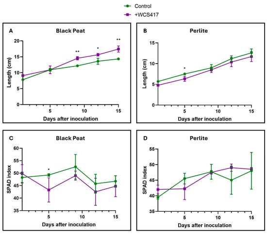 Effect of the inoculation of the WCS417 strain by the irrigation of tomato plants grown in the substrate. After the inoculation of tomato plants with 100 mL of a 107 CFU mL−1 bacterial suspension, SPAD and height data were collected for a period of 15 days. (A) Height of tomato plants grown in black peat. (B) Height of tomato plants grown in perlite. (C) Chlorophyll levels of tomato plants grown in black peat. (D) Chlorophyll levels of tomato plants grown in perlite. * p < 0.05, and ** p < 0.01 indicate significant differences between control and inoculated treatments. Values are the means ± S.E. of 12 replicates.