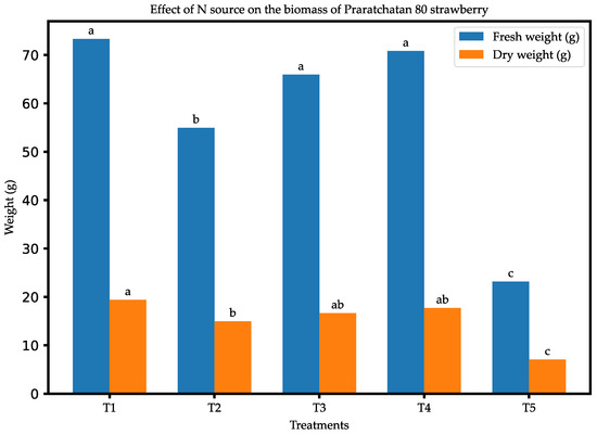 3−), influence nitrogen uptake, distribution, and utilization in strawberry plants. This knowledge gap hinders the development of optimized fertilization strategies that can enhance strawberry yield and quality. Despite the recognized importance of nitrogen, the specific influence of different nitrogen sources on uptake and allocation patterns in strawberry plants, particularly in the ‘Praratchatan 80’ cultivar under evaporative greenhouse conditions, remains poorly understood. Thus, more research is needed to increase our understanding of the effects of nitrogen sources on nitrogen uptake and utilization in strawberry plants. Therefore, the present study aimed to evaluate the effects of these sources on the uptake and distribution of nitrogen in cultivar ‘Praratchatan 80’ strawberries under evaporative greenhouse conditions and using the