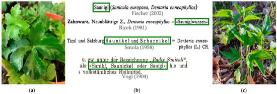 (a) Leaves of Sanicula europaea L. (Engl. wood sanicle, German: Sanikel); (b) examples of Austrian vernacular names of drooping bittercress from the literature (Fischer (2002) [19], Ricek (1981) [18], Smola (1958) [22], Vogl (1904) [24]); (c) aerial parts of Cardamine enneaphyllos (L.) Crantz (old synonym Dentaria enneaphyllos L., Engl. drooping bittercress, German: Neunblatt-Zahnwurz).