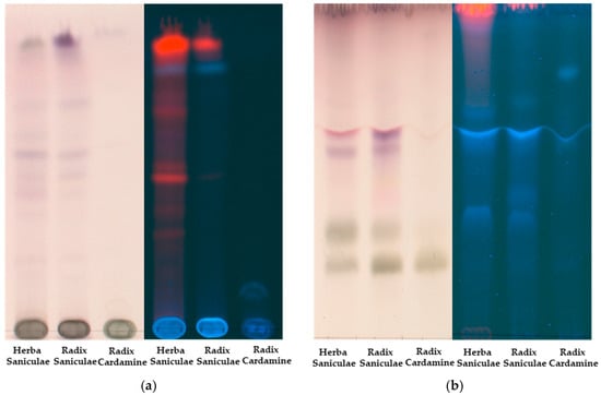 A first comparison of all methanolic extracts was conducted using TLC. In the more apolar system A (Figure 2a), Radix and Herba Saniculae exhibited similar light spots, with more intensive red fluorescent chlorophyll spots in the aerial than in the underground parts. Radix Cardamines enneaphyllos required a more polar system since the sample components remained at the starting line, similar to a large fraction of unresolved compounds in both sanicle extracts. Using the more polar system B (Figure 2b), the same two spots could be found in all three extracts after derivatization with anisaldehyde/sulfuric acid: a dark green spot at Rf 0.31 and another just below, at Rf 0.23. Using pure substances, these spots were identified as disaccharides such as sucrose (Rf 0.23) and monosaccharides such as glucose and fructose (Rf 0.31). Furthermore, the extracts of Sanicula europaea showed similar purple spots at Rf 0.57 and Rf 0.62 after derivatization with anisaldehyde, indicating terpenoids [27]. Since it is known that sanicle contains saponins [8], another derivatization method was conducted to verify the suspicion that these purple spots were saponins. Therefore, the characteristic hemolytic activity of saponins [28] was tested using erythrocytes in human blood to make the respective spots on the TLC plate visible (Figure S1).