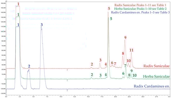 The following supporting information can be downloaded at https://www.mdpi.com/article/10.3390/plants14020266/s1: Figure S1. TLC of the extract Herba Saniculae in system B derivatized with anisaldehyde (left) and blood gelatin (right). Figure S2: UHPLC-ESIMS base peak chromatogram in positive mode (upper) and in negative mode (middle) and CAD chromatogram (lower) of Radix Saniculae. Figure S3: UHPLC-ESIMS base peak chromatogram in positive mode (upper) and in negative mode (middle) and CAD chromatogram (lower) of Herba Saniculae. Figure S4: UHPLC-ESIMS base peak chromatogram in positive mode (upper) and in negative mode (middle) and CAD chromatogram (lower) of Radix Cardamines enneaphyllos. Table S1: UV spectra and mass spectra (negative mode upper spectrum; positive mode lower spectrum) of main peaks found in the extracts of Radix Saniculae. Table S2: UV spectra and mass spectra (negative mode upper spectrum; positive mode lower spectrum) of main peaks found in the extracts of Herba Saniculae. Table S3: UV spectra and mass spectra (negative mode upper spectrum; positive mode lower spectrum) of main peaks found in the extracts of Radix Cardamines enneaphyllos. Table S4. GC-MS data detected for sisymbrin and cleomin in fresh Cardamine enneaphyllos roots.