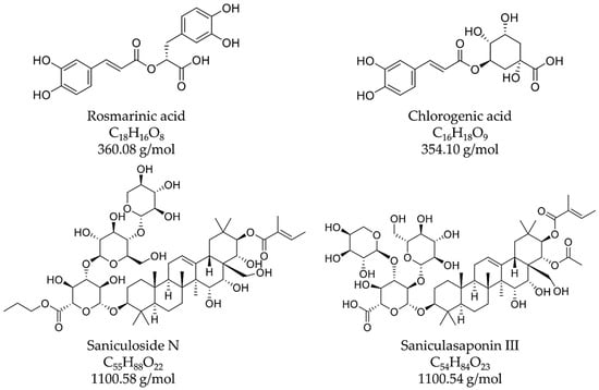 Structural and molecular formulas and monoisotopic masses of the hydroxycinnamic acid derivatives rosmarinic acid (upper left) and chlorogenic acid (upper right) and the saponins saniuloside N (lower left) and saniculasaponin III (lower right).