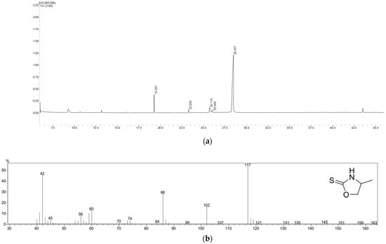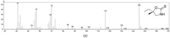 The total ion chromatogram is depicted in Figure 6a; sisymbrin eluted at 25.72 min, and cleomin eluted at 28.46 min. The mass spectra found for sisymbrin and cleomin matched those recorded by Jurenitsch et al. [20]: sisymbrin shows a base peak at m/z 117 and a fragment at m/z 102, which corresponds to the cleavage of a methyl group (Figure 6b and Table S4). Cleomin has a base peak at m/z 145, and eliminating a methyl and an ethyl group leads to fragments at m/z 130 and m/z 116 (Figure 6c and Table S4).