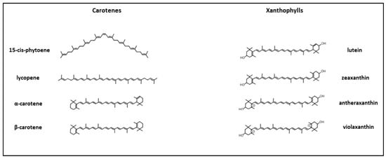 Carotenoids are a vast group of over 1200 tetraterpenoid compounds comprising carotenes, linear or cyclized hydrocarbons with a variable number of conjugated double bond systems, and xanthophylls, their oxygenated derivatives []. Structures of some carotenoids are presented in Figure 1.