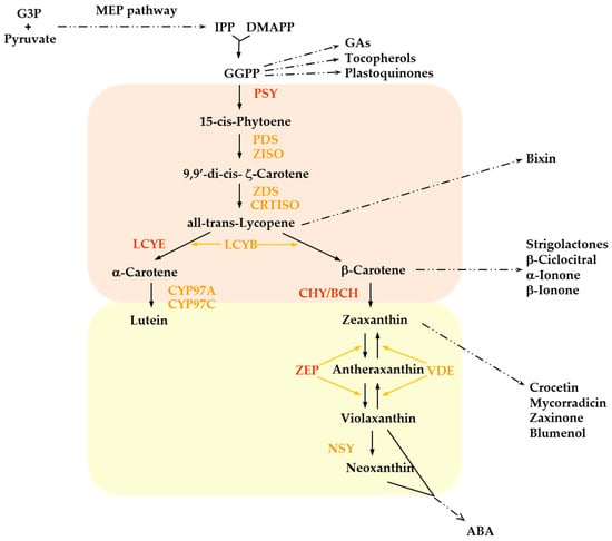 Plant carotenoids are produced in all types of differentiated plastids, primarily chloroplasts in green tissues and chromoplasts in flowers, fruits, and roots. In potato tubers, amyloplasts are the main site of carotenoid biosynthesis and storage []. The core carotenoid biosynthetic pathway is depicted in Figure 2.