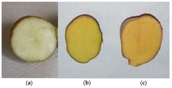 Cross-sections of potato tubers with different flesh color and from different Solanum species (a) S. chacoense (2n) (b) S. tuberosum (4n) (c) S. phureja (2n).