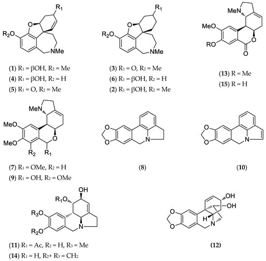 - Berkov, S.; Atanasova, M.; Georgiev, B.; Bastida, J.; Doytchinova, I. The Amaryllidaceae Alkaloids: An Untapped Source of Acetylcholinesterase Inhibitors. Phytochem. Rev. 2022, 21, 1415–1443. [Google Scholar] [CrossRef]