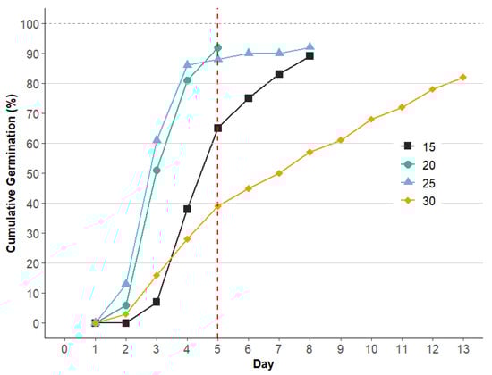 | Temperature | GP (%) | GE (%) | GSI | MGT (days) | T50 (days) |