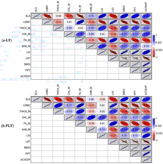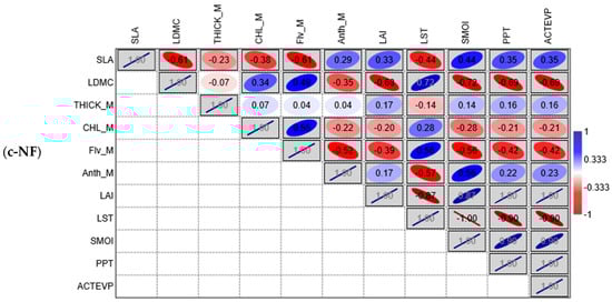 The correlation matrix shows the results of Pearson’s correlation analysis, which was performed separately on (a) UF—urban forest, (b) PUF—peri-urban forest, and (c) NF—natural forest stands. Pearson’s correlation coefficient values and directions are displayed with the following rule: positive correlation from white to blue and negative correlation from white to red on the color scale. Boxes are marked gray when p < 0.05. The inclination of the ellipse is representative of the positivity or negativity of the correlation, while its smaller or larger range indicates the intensity of the correlation. SLA = specific leaf area; LDMC = leaf dry matter content; THICK_M = leaf thickness; Flv_M = flavonol content; CHL_M = chlorophyll content; Anth_M = anthocyanin content; LAI = leaf area index; LST = land surface temperature; PPT = precipitation; SMOI = soil moisture; and ACTEVP = actual evapotranspiration.