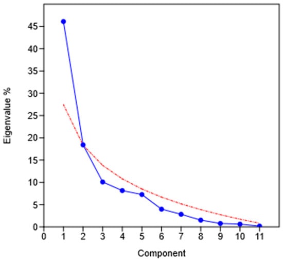 Principal component analysis scree plot of the eigenvalues (blue) with “broken stick” (red: eigenvalues expected under a random model), in which it is shown that the first two components explain more than 64% of the variance.