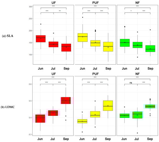 Two-way ANOVA box plots (a Tukey post hoc analysis was used to test statistical significance: ns = not significant, · = p < 0.1, * = p < 0.05, ** = p < 0.01, *** = p < 0.001) that describe the trends of the three stands (green—natural forest; yellow—peri-urban forest; and red—urban forest) in three periods (from left to right: Jun = June, Jul = July, and Sep = September). (a) Specific leaf area (SLA). (b) Leaf dry matter content (LDMC).