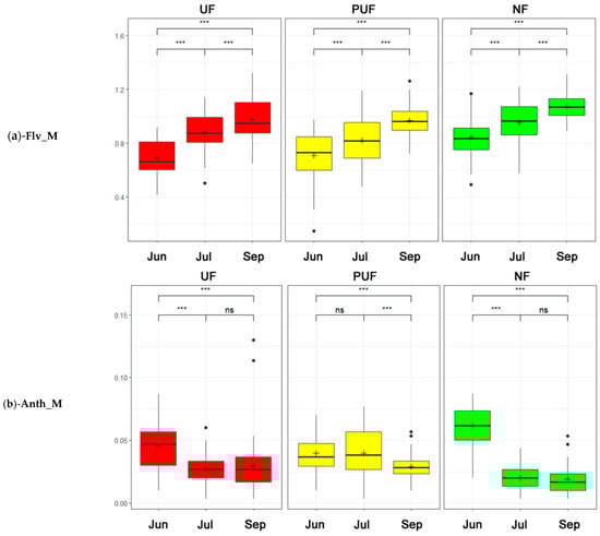 Two-way ANOVA box plots (a Tukey post hoc analysis was used to test statistical significance: ns = not significant, · = p < 0.1, *** = p < 0.001) that describe the trends of the three stands (green—natural forest; yellow—peri-urban forest; and red—urban forest) in three periods (from left to right: Jun = June, Jul = July, and Sep = September). (a) Flavonol content (Flv_M). (b) Anthocyanin content (Anth_M).