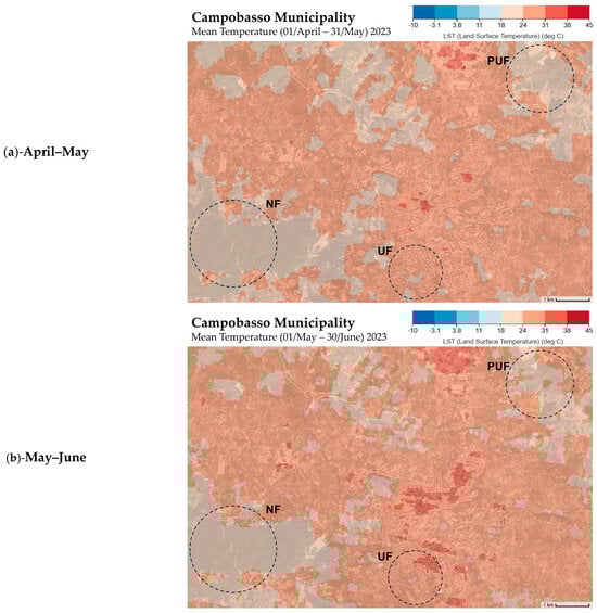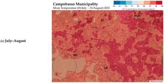 Land surface temperature (LST) maps of the Campobasso municipality (https://app.climateengine.org/climateEngine (accessed on 1 August 2024)), representing the mean temperature of the two months before each sampling date: (a) April–May for the June sampling; (b) May–June for the July sampling; and (c) July–August for the September sampling. NF—natural forest; PUF—peri-urban forest; and UF—urban forests.