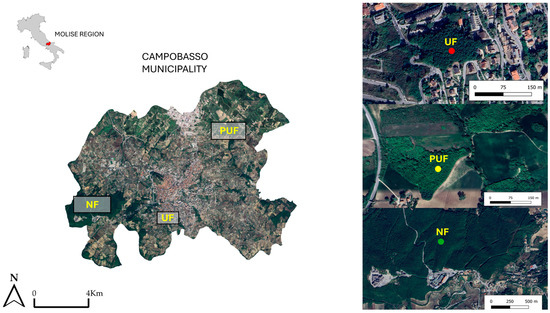 The study area is located in the Campobasso municipality (Molise region, Southern Italy) (Figure 10), a small Mediterranean city that is 80 km from the Adriatic Sea; it is one of the eight Italian municipalities included in the studies of the National Biodiversity Future Centre (NBFC). The stands were chosen within a grid measuring cells of 1 km × 1 km developed by an interdisciplinary group (Spoke 5: Urban Biodiversity), who aimed to improve our knowledge of biodiversity in Italian cities and to provide new insights to protect and enhance nature in built-up areas (https://www.nbfc.it/en/environments (accessed on 1 August 2024)). The three cells were selected along a gradient of fragmentation and green cover. They corresponded to an urban forest (UF), a peri-urban forest (PUF), and a natural forest (NF) [50]. The natural forest is included in the Special Area of Conservation (SAC) IT7222295 “Monte Vairano” (Directive Habitat 92/43 EEC).