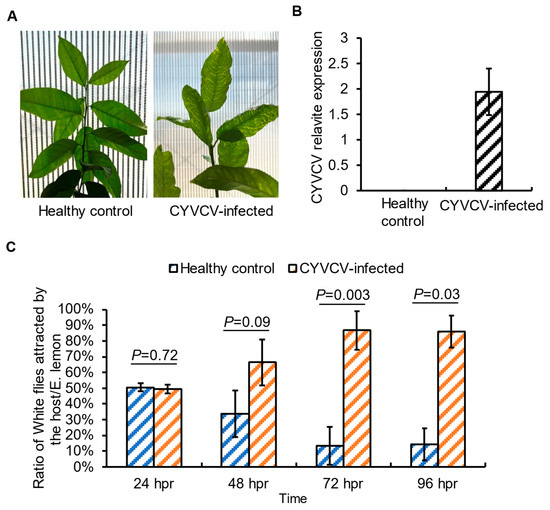 Citrus yellow vein clearing virus (CYVCV)-infected Eureka lemon attracted more citrus whiteflies compared to the healthy control. (A). A typical branch of Eureka lemon (Citrus limon) showing a typical CYVCV-induced yellow vein clearing phenotype and healthy control in the greenhouse. (B). RT-qPCR data verify the infection of CYVCV in the virus-bearing plants. The citrus Nad5 gene was used as an internal control. A similar trend was obtained from three biological repeats. (C). Periodic observation of the citrus whitefly free-choice bioassays. A similar trend was obtained from three biological repeats. hpr: hours post (insect)-release.