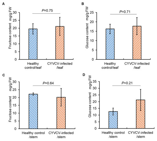 Sugar analysis in samples of Citrus yellow vein clearing virus (CYVCV)-infected Eureka lemon and healthy controls. (A,B). Fructose and Glucose content in the leaves of CYVCV-infected Eureka lemon and healthy plants. (C,D). Fructose and glucose content in the stems of CYVCV-infected Eureka lemon and healthy plants. Three biological repeats were conducted. No significant difference was observed in all measurements using the two-tail Student’s t-test. FW: fresh weight.