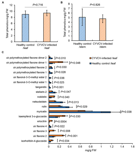 Phenolics levels detected in leaves of Citrus yellow vein clearing virus (CYVCV)-infected Eureka lemon, compared to those in healthy control. (A). Total phenolics levels in the leaves of healthy and CYVCV-infected Eureka lemon. No significant difference was observed with p > 0.05 using the two-tail Student’s t-test. (B). Total phenolics levels in the stem of healthy and CYVCV-infected Eureka lemon. Three biological repeats were conducted. No significant difference was observed with p > 0.05 using the two-tail Student’s t-test. (C). Eighteen individual phenolics that exhibit significant difference in the two groups of leaf samples. Three biological repeats were conducted. uk: unknown.