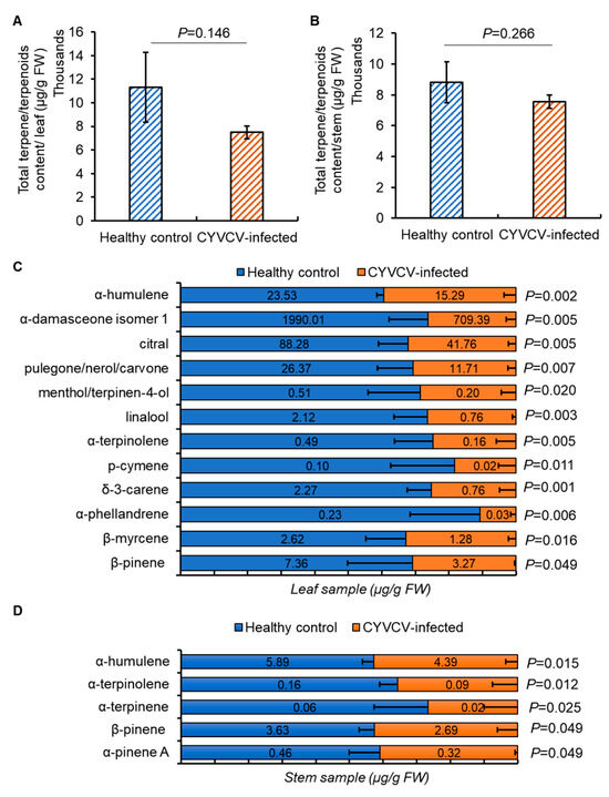 Volatile terpene/terpenoid analysis in samples of Citrus yellow vein clearing virus (CYVCV)-infected Eureka lemon and healthy control. (A). Total terpene/terpenoid levels in the leaves of CYVCV-infected Eureka lemon and healthy plants. No significant difference was observed. (B). Total terpene/terpenoid levels in the stem of CYVCV-infected Eureka lemon and healthy plants. Three biological repeats were conducted. No significant difference was observed. (C). Twelve individual terpenoids exhibit significant difference in the two groups of leaf samples. (D). Five individual terpenoids exhibit significant difference in the two groups of stem samples.
