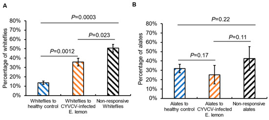 2.1. Plant Infection by CYVCV Alters the Settling Behavior of Non-Viruliferous Citrus Whiteflies