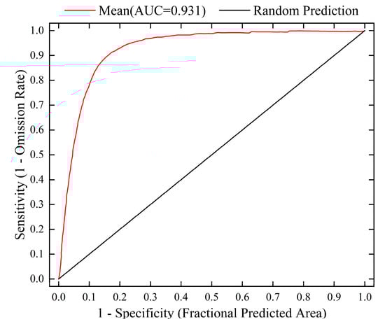 This study used the ROC curve to evaluate the species distribution model [63,64], running the MaxEnt model ten times with all data and taking the average AUC value from these runs to assess the model’s accuracy [65,66]. It is generally believed that a higher AUC value suggests a closer alignment between the model’s predicted species distribution and the actual distribution. The findings show that the average AUC value of the model is 0.931 with a standard deviation of 0.003, which proves that the prediction results are accurate and the model fitting is excellent, which can reflect the potential geographic distribution of L. secalinus in China extremely accurately.