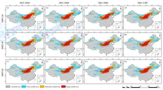 Potential distribution of L. secalinus under the SSP1-26 (A1–A4), SSP2-45 (B1–B4) and SSP5-85 (C1–C4).