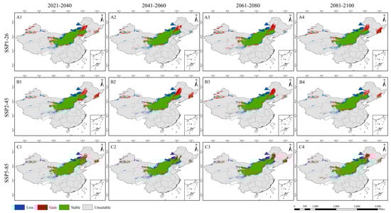 Potential changes in high- and medium-suitability areas for L. secalinus considering different SSPs. Changes in distribution highlighted in different colors; for gain (range expansion), red; loss (range contraction), blue; unsuitable, grey; and stable, green. (A1–A4) SSP1-26, (B1–B4) SSP2-45 and (C1–C4) SSP5-85.