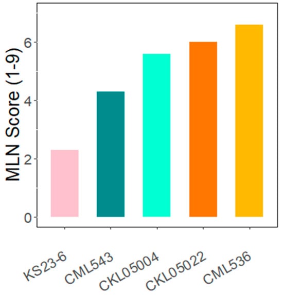 Phenotypic effect of MLN. Average field MLN phenotypic scores of five lines collected in Naivasha, Kenya.