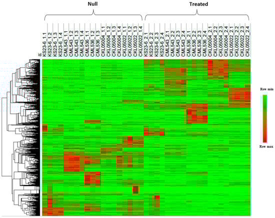 Heatmap clustering of 2503 differentially expressed genes based on their normalized counts. Each row of the heatmap represents the gene count in each genotype before and after inoculation. Red indicates high counts of a gene in a biological replicate, while green indicates lower counts of a gene. “Null” indicates the expression before inoculation, and “treated” indicates expression after MLN inoculation.