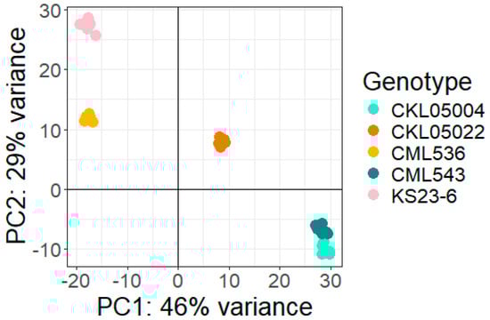 Principal component analysis (PCA) of the 39,000 gene models based on their normalized counts is shown in Figure 3. PC1 showed that CML543 and CKL05004 were closely related but divergent from the other CMLs. PC1 showed that CML543 and CKL05004 were closely related but divergent from the other CMLs. CKL05002 appeared more different across all the lines. KS23-6 clustered closer to CML536; however, there was a significant difference in the other lines. KS23-6 is a tropical line from Thailand. This proximity may indicate shared ancestry or a common breeding history influencing their genetic composition.