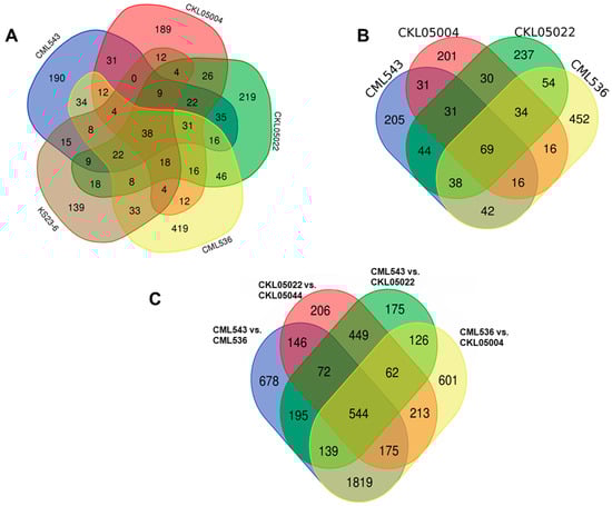 Differentially expressed genes (DEGs). (A) Venn diagram of the DEGs in five lines under MLN stress, (B) Venn diagram of the DEGs in CIMMYT lines, and (C) Venn diagram of the DEGs of the genotype vs. genotype comparison.