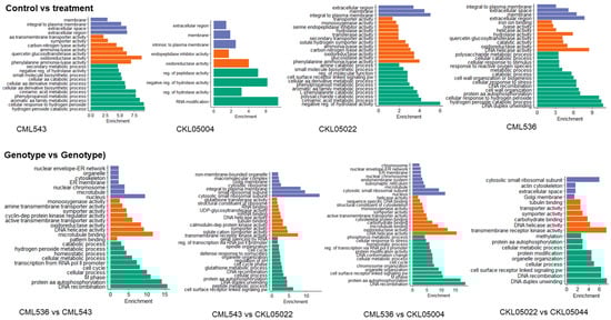 Functional enrichment analysis was performed to study the DEGs further. We considered three categories of GO enrichment analysis (biological process (BP), molecular function (MF), and cellular component (CC)). Across all the comparisons and lines, GO terms related to stress/defense response were enriched; for instance, in the control vs. treatment group, GO terms significantly enriched in CML543 included the hydrogen peroxide catabolic pathway (GO:0042744) and cellular response to hydrogen peroxide (GO:0070301) (Figure 5; Table S4). CKL05004 showed enrichment in RNA modification (GO:0009451), while CKL05022, among the many GO terms enriched, was cell surface receptor-linked signaling pathways (GO:0007166) (Figure 5; Table S4). CML536 showed enrichment in DNA duplex unwinding (GO:0032508), the hydrogen peroxide catabolic process (GO:0042744), and protein amino acid autophosphorylation (GO:0046777), while in molecular function, DNA helicase activity (GO:0003678) was enriched (Figure 5; Table S3). On the other hand, KS23-6 showed enrichment of secondary metabolic processes, including flavonoids and phenylpropanoid biosynthetic processes, which were also seen in CML543. Across all the lines, oxidoreductase activity (GO:0016709) was enriched in molecular function.