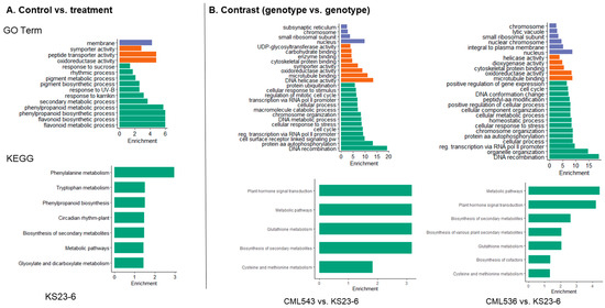 Gene Ontology (GO) and KEGG enrichment of DEGs in KS23-6. Column (A) shows the GO terms and KEGG of DEGs in KS23-6 after comparing the control vs. treatment groups, and column (B) shows GO terms and KEGG pathways after comparing KS23-6 DEGs to CML543 and CML536. In both, a Fisher’s exact test and Bonferroni correction were used to identify the significantly (p-value < 0.05) enriched GO terms and KEGG pathways. In the GO term bar charts, the Y-axis represents the DEGs’ biological process (green), molecular function (orange), and cellular component (purple), while the X-axis represents the positive values of the estimated p-values, calculated as −log10(p-value) via Go term analysis.
