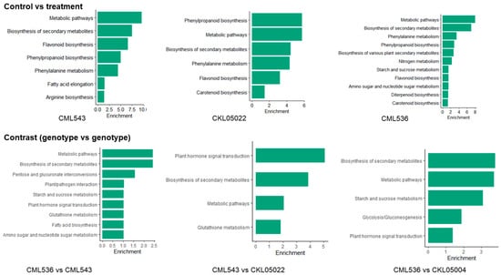 To characterize the complex behavior of the maize transcriptome, all the DEGs were subjected to a KEGG pathway enrichment analysis. Similar to GO enrichment, in KEGG, pathways associated with stress/defense response were enriched. In the control vs. treatment comparison, the biosynthesis of secondary metabolites was central, where biosynthesis and metabolism of various secondary metabolites were indicated across all the CMLs and KS23-6 (Figure 6 and Figure 7; Table S6). Some secondary metabolite pathways observed were flavonoid biosynthesis, phenylpropanoid biosynthesis, carotenoid biosynthesis, and diterpenoid biosynthesis (Figure 7; Table S6). Only one KEGG pathway, Ribosome biogenesis in eukaryotes, was identified in CKL05004 (Table S6). In the genotype vs. genotype comparisons, including the biosynthesis of secondary metabolites, plant hormone signal transduction was also central. In CML536 vs. CML543, CML536 vs. KS23-6, and CML543 vs. KS23-6 comparisons, the pathway involving plant–pathogen interactions was enriched (Figure 6 and Figure 7; Table S6). The glutathione metabolism pathway was enriched only in CML543 vs. CKL05022, CML536 vs. KS23-6, and CML543 vs. KS23-6 comparisons.