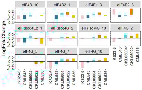 Table S8 shows the expression pattern of different translation initiation factors. We found 32 eIFs, including 1 eIF1, 6 eIF2s, 8 eIF3s, 11 eIF4s (4B, 4E, 4G, and their isoforms), 3 eIF5s, 2 eIF6s, and 1 eIF7, respectively. Although the expression values are not significant based on the base mean change in gene count between the treatments (log2foldchange > +2 or <−2), there is a detectable differential expression of translation initiation factors correlated to MLN stress (Table S8). For instance, the expression pattern of eIF4E, eIF4E1_3 (Zm00001d041682) and eIF4E2_3 (Zm00001d041973), and eIF(iso)4E2_1 (Zm00001d032775) varied across the genotypes (Table 1, Figure 8). In KS23-6, the expression pattern shows an upregulation of eIF4E1_3 and eIF(iso)4E2_1 but a downregulation in eIF4E2_3, while CKL05004 portrays an opposite expression pattern to that of KS23-6 (Table 1, Figure 8). In contrast, all the eIF4Es are downregulated in CML543. The locations of eIF4E1_3 and eIF4E2_3 on chromosome 3 could be linked to previously identified QTL associated with MLN, mapped on CML543 [,]. A recent CRISPR-Cas9 knockout study targeting eIF4E1 and mutations in exon 4 of eIF4E2 conferred resistance to SCMV, suggesting that the observed downregulation of eIF4E in CML543 likely disrupts SCMV growth and replication []. Of note, the upregulation of some of eIF4E in KS23-6 further confirms that KS23-6 does not confer resistance to SCMV. Although the differential expression of eIF(iso)4G_2 (Zm00001d003147) is not indicated in CML543, the expression pattern of the gene shows an expression difference in SSA non-adapted lines (KS23-6), where it is downregulated, and the CMLs, where it is upregulated. The expression of 4Gs in the CML543 is only notable in eIF4G_2 (Zm00001d006573), eIF4G_7 (Zm00001d021741), and eIF4G_10 (Zm00001d025979), where they are downregulated. eIF4G_2 and eIF4G_7 show definitive differences in CML543 and KS23-6 with the other CMLs, portraying a clear difference in phenotypic response. This regulation pattern indicates a response of eIF4 to MLN. Given this difference in expression, it would be interesting to examine these genes further as candidate genes for MLN resistance. Understanding the significance of these expression patterns can provide more insight into their relevance to response to viral infection and can be harnessed for managing MLN.