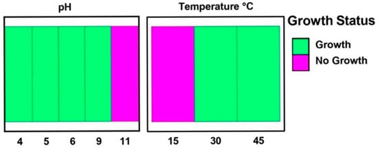 To understand how environmental pH affected P. yamanorum’s viability, the strain was cultivated on LB medium with a range of pH values, from acidic (pH 4) to extremely alkaline (pH 11). When exposed to slightly acidic to moderately basic conditions (pH 4 to 9), P. yamanorum showed vigorous growth. The fact that no growth was observed at pH 11 illustrates that extremely alkaline environments prevent the growth of the bacteria. Based on these results, it appears that P. yamanorum can adapt to a wide pH range, with near-neutral to slightly alkaline environments promoting optimal growth (Figure 1). Furthermore, P. yamanorum showed a considerable degree of thermotolerance by positively growing at 30 °C, as well as at 45 °C. However, its metabolic activity appears to be limited at lower temperatures, as no growth was observed below 15 °C. According to these results, P. yamanorum is well adapted to mesophilic and moderately high-temperature environments and less appropriate for colder climates (Figure 1).