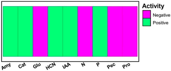 Biochemical profile of Pseudomonas yamanorum for plant growth-promoting traits and extracellular enzymatic activity. (Amy: Amylase, Cat: Catalase, Glu: Glucanase, HCN: Hydrogen cyanide, IAA: Indole-3-acetic acid, N: Nitrogen fixation, P: Phosphate solubilization, Pec: Pectinase, Pro: protease). Green bars indicate positive activity; pink bars indicate negative activity.