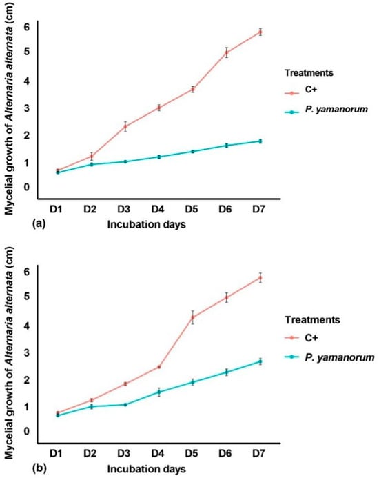 The in vitro trials demonstrated that P. yamanorum possesses an important antagonistic impact at a standard concentration of 108 CFU mL−1 against A. alternata in both direct (Figure 3a) and indirect (Figure 3b) confrontation tests.