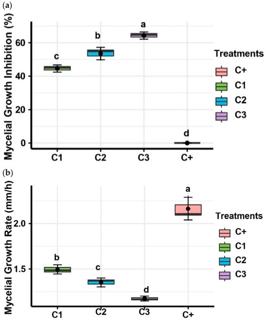 Effect of Pseudomonas yamanorum filtrates at different concentrations (10% (C1), 20% (C2), and 40% (C3)) on the mycelial growth inhibition (a) and rate (b) of Alternaria alternata after 7 days of incubation. (C+: positive control, Alternaria alternata only). Different letters above the error bars indicate significant differences between treatments (p < 0.05) according to Duncan’s test, where treatments sharing the same letters are not significantly different. The value represents the mean of the 10 replicates ± standard error.