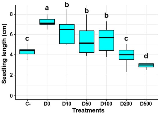 Effect of Pseudomonas yamanorum culture filtrate dilutions (D0, D10, D50, D100, D200, D500) on tomato seedling growth. C-: negative control (water only). Different letters above the boxplots indicate significant differences among treatments according to Duncan’s test (p < 0.05), where treatments sharing the same letter are not significantly different. The value represents the mean of the 30 replicates ± standard error.
