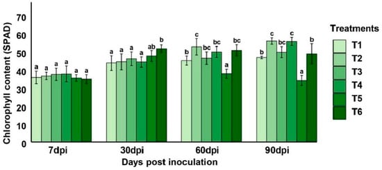 Impact of preventive treatments of Pseudomonas yamanorum and salicylic acid on the chlorophyll content in tomato leaves infected with Alternaria alternata at three sampling moments (30, 60, and 90 days post-inoculation). (T1: P. yamanorum 107 CFU mL−1 + A. alternata), T2 (P. yamanorum 108 CFU mL−1+ A. alternata), T3 (P. yamanorum 107 CFU mL−1 + salicylic acid + A. alternata), T4 (salicylic acid+ A. alternata), T5 (A. alternata), T6 (untreated). Different letters above the error bars indicate significant differences between treatments (p < 0.05) according to Duncan’s test, where treatments sharing the same letters are not significantly different. The value represents the mean of the 20 replicates ± standard error.
