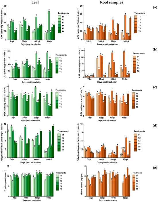 Impact of treatments on tomato plant defense mechanisms of tomato leaf and roots samples at four sampling moments (7, 30, 60, and 90 days post inoculation) (APX: Ascorbate peroxidase (a); CAT: Catalase (b); POX: peroxidase (c); Polyphenol content (d); protein content (e)). (T1: P. yamanorum 107 CFU mL−1 + A. alternata), T2 (P. yamanorum 108 CFU mL−1 + A. alternata), T3 (P. yamanorum 107 CFU mL−1 + salicylic acid + A. alternata), T4 (salicylic acid + A. alternata), T5 (A. alternata), T6 (untreated). Different letters above the error bars indicate significant differences between treatments (p < 0.05) according to Duncan’s test, where treatments sharing the same letters are not significantly different. The value represents the mean of the 20 replicates ± standard error.