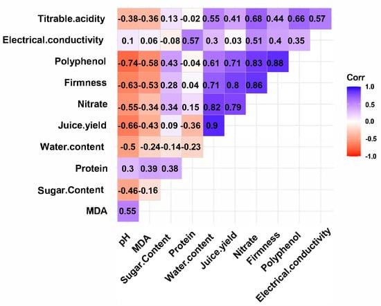 Pearson’s correlation coefficients (r) from the analysis of tomato fruit quality attributes, including pH, MDA, sugar content, protein, water content, juice yield, nitrate, firmness, polyphenol, and electrical conductivity.