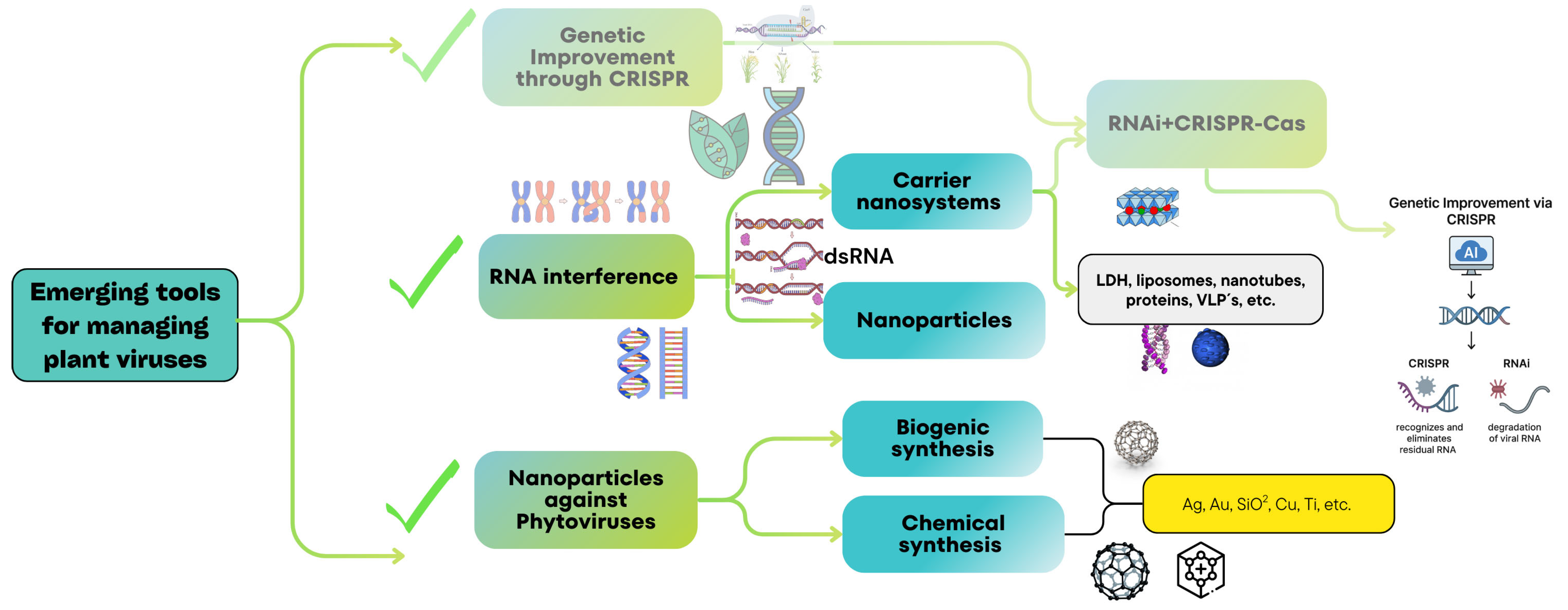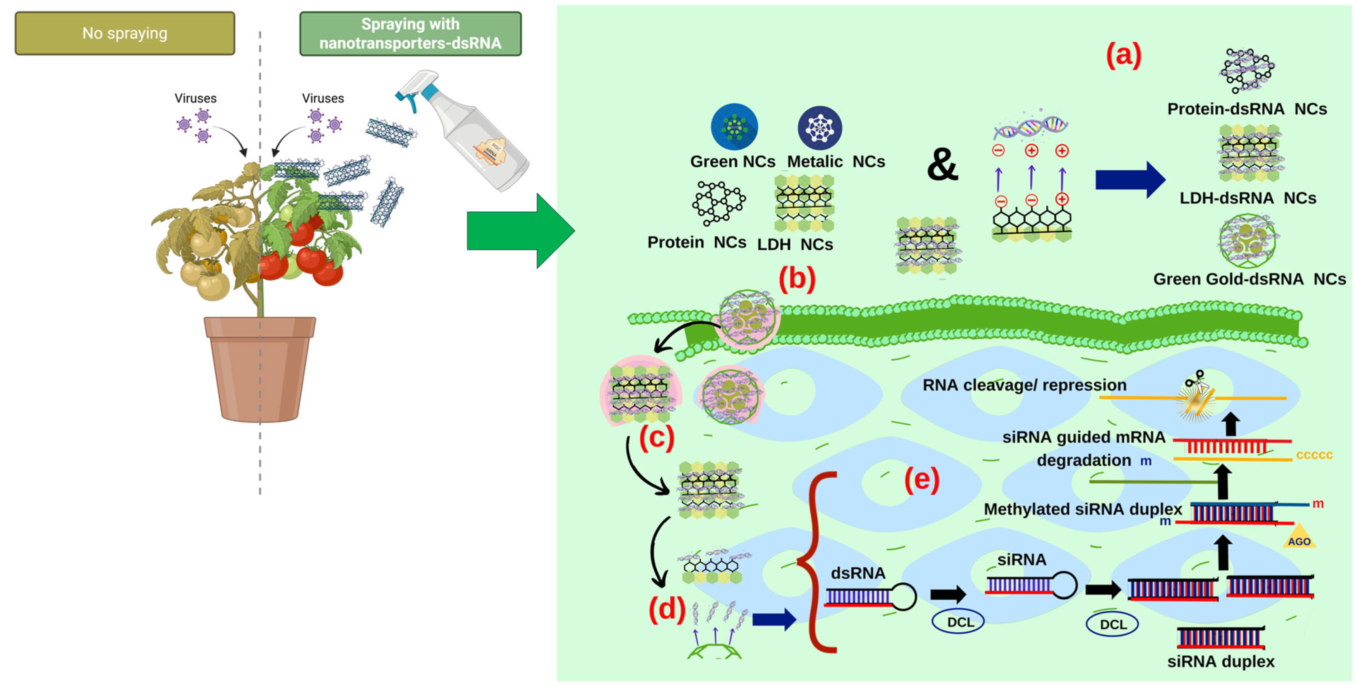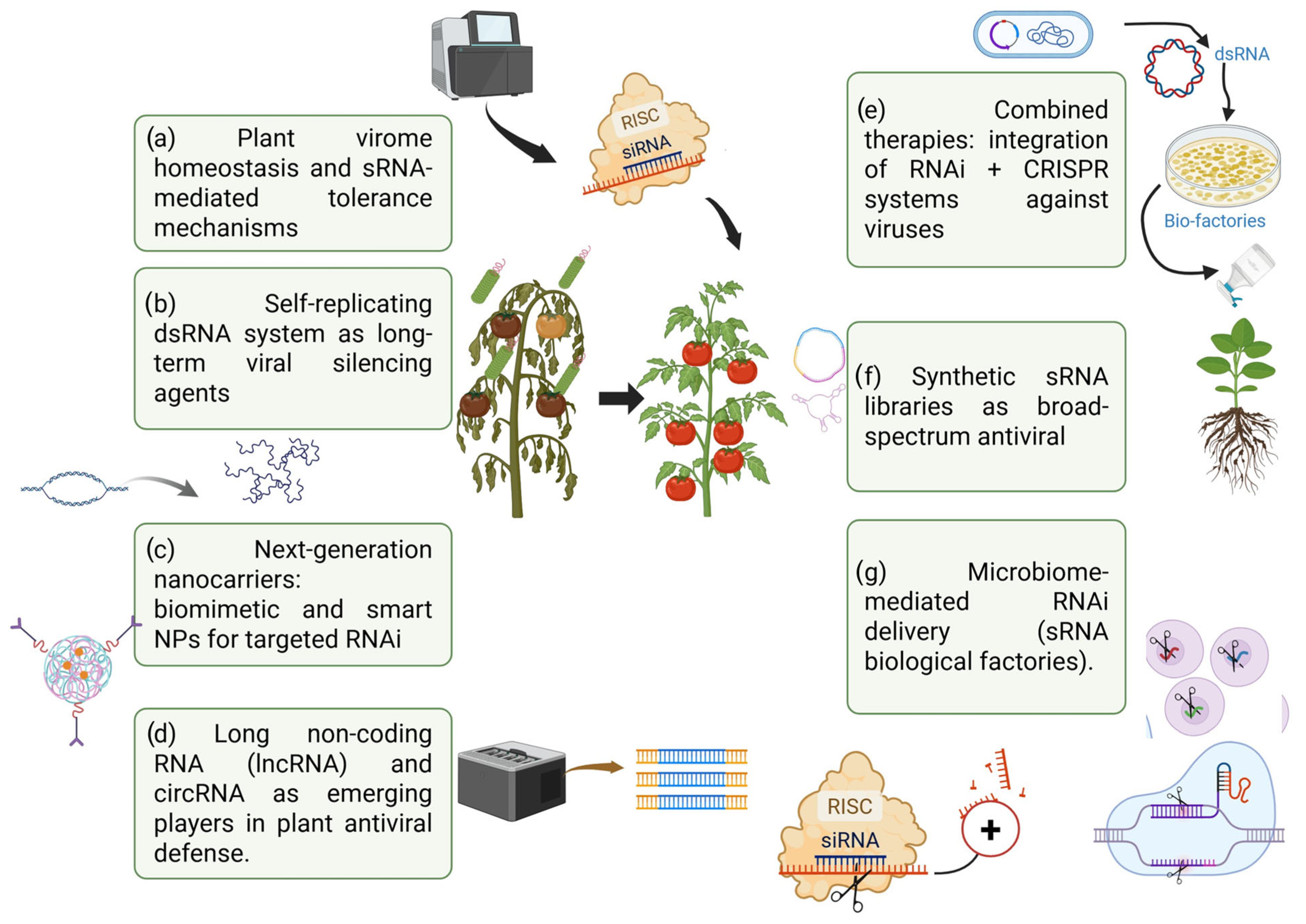 - Next-generation nanocarriers: biomimetic and intelligent nanoparticles for targeted RNAi. The idea of using biomimetic nanoparticles that mimic viruses or target ligands to recognize infected cells, release dsRNA specifically in infected tissues, and reduce off-target effects. The emergence of smart reactive delivery systems (activated by pH, ROS, and viral protease activity) could have antiviral uses in plants, although these have not yet been described.