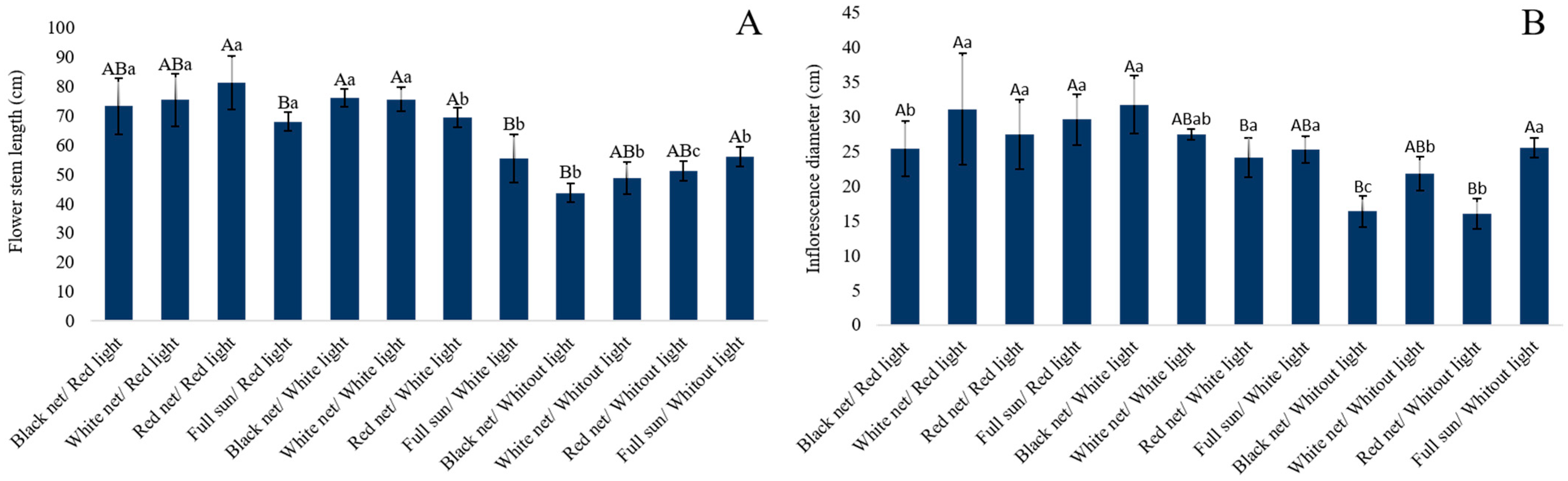 The data analysis showed a significant interaction between colored shade nets and the use of LED lights for the photoperiod extension, stem length, inflorescence width, number of stems per plant, and number of stems per square meter. Inflorescence length and fresh stem biomass showed significance for these factors alone, while the floral scape diameter showed a difference only for nets. Moreover, the number of leaves and number of floral branches showed no statistical difference.