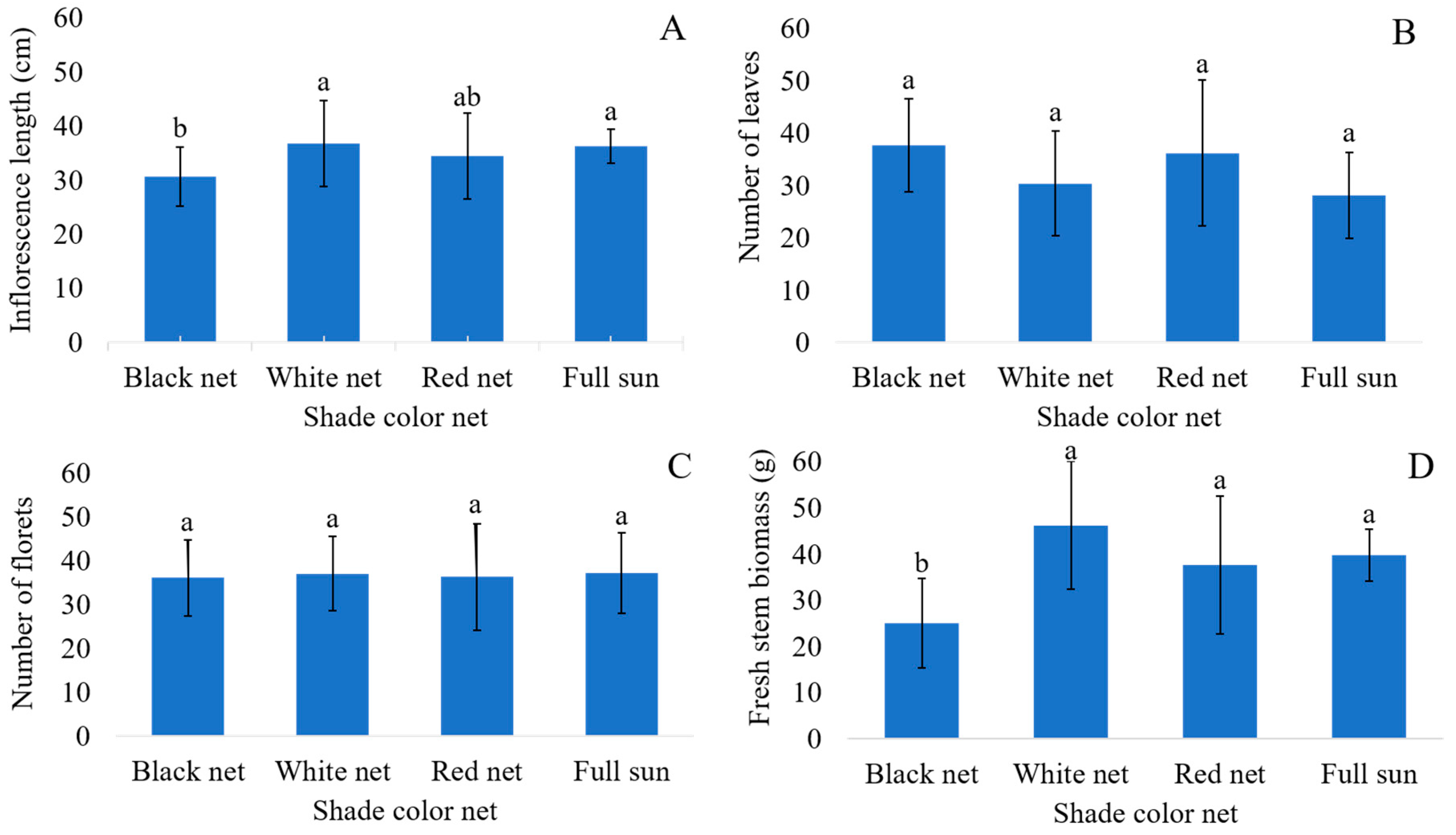 Figure 3A). Inflorescences grown under the white-colored shade net and full sun had a higher length, which was not different than those grown under the red-colored shade net, which in turn did not differ from the length of the stems of plants grown under the black-colored shade net, although the latter was inferior to the first two (