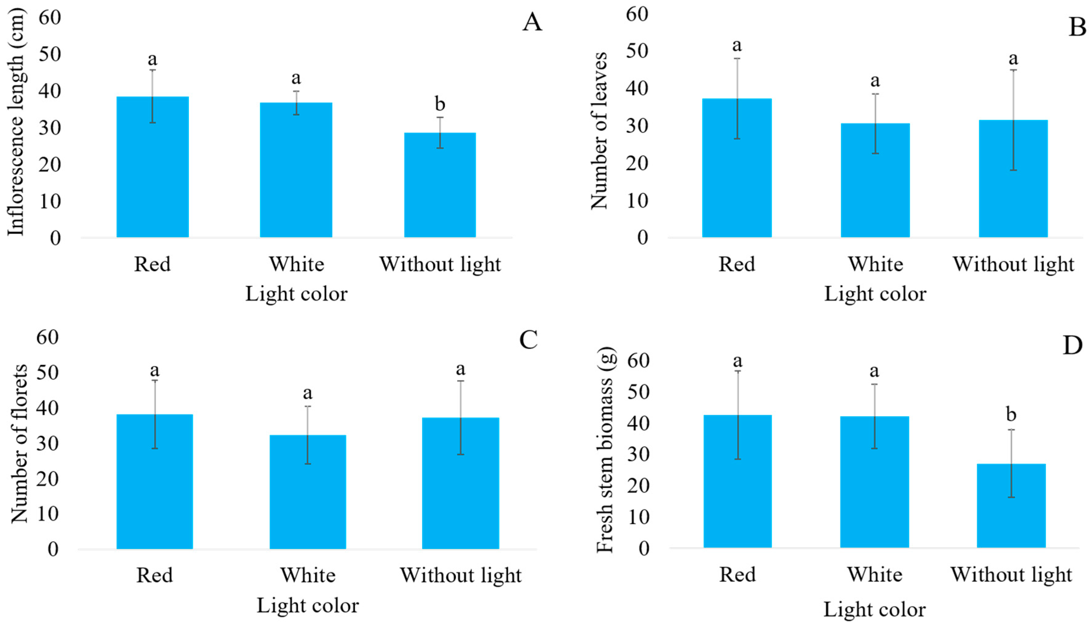 Figure 2A). Regarding the use of LED, greater inflorescence lengths were found in plants grown with the use of lighting, regardless of whether the LED light used was red or white (