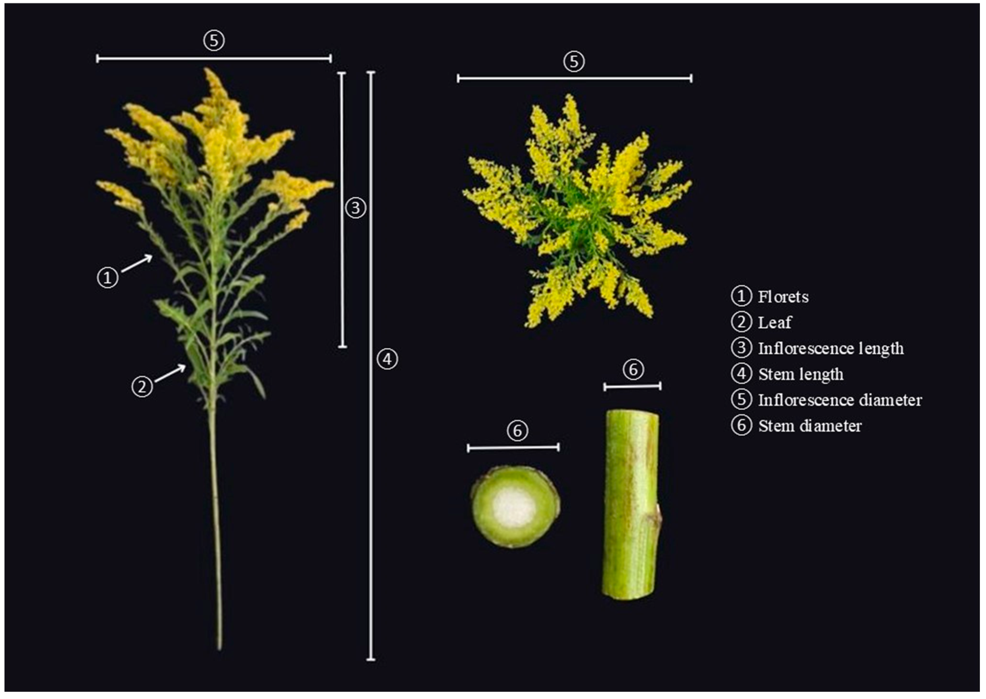 The morphometric parameters of flower stems are generally the most commonly considered parameters for determining product quality. Because Canada goldenrod is a plant, differences occur among the stems produced, mainly in response to environmental variables and agronomic practices, with higher-quality stems being marketed with a higher added value. These differences in measurements allow for Canada goldenrod stems to be divided into classes, which can vary according to a combination of parameters, notably, stem length, which ranges from 40 to 80 cm, and weight, with a minimum acceptable weight for the Brazilian market of 10 g. Furthermore, the stem flowers must be straight and not present curvatures or inclinations or phytosanitary problems [